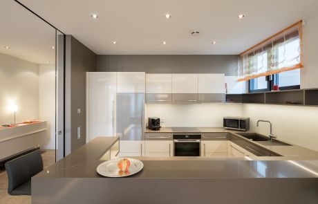 Ein besonderes Highlight ist der multifunktionale Wohn-, Küchen- und Terrassenbereich. Große Glasschiebeelemente ermöglichen flexible Raumkonzepte: Die Küche kann vollständig abgetrennt oder in den Wohnbereich integriert werden. Zusätzlich lassen sich die Fassadenschiebeelemente weit öffnen – so wird der Wohnraum im Sommer komplett ins Freie erweitert und sorgt für ein einzigartiges Wohnerlebnis unter freiem Himmel.